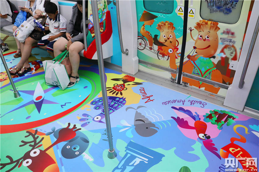 色彩斑斕的車廂內(nèi)壁,滿是土豆形狀的小人,卡通版的自由女神像,城堡、大海、森林、國寶大熊貓等,讓人仿佛置身在五顏六色的童話世界。 -
