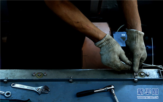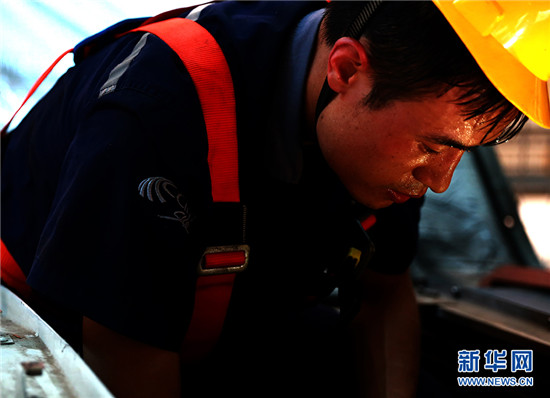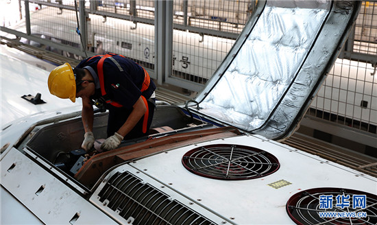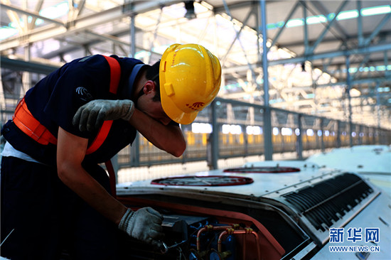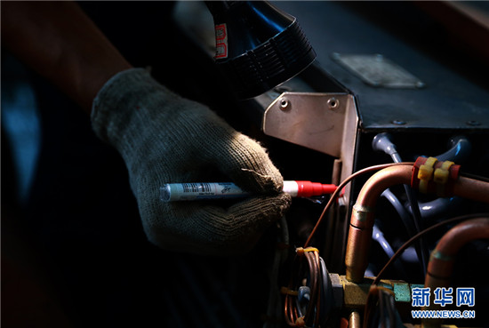 在高達(dá)50℃的動(dòng)車(chē)檢修廠內(nèi),動(dòng)車(chē)組機(jī)械師李洲正在對(duì)CRH380B型動(dòng)車(chē)組空調(diào)系統(tǒng)進(jìn)行故障處理。新華網(wǎng) 石璐 攝