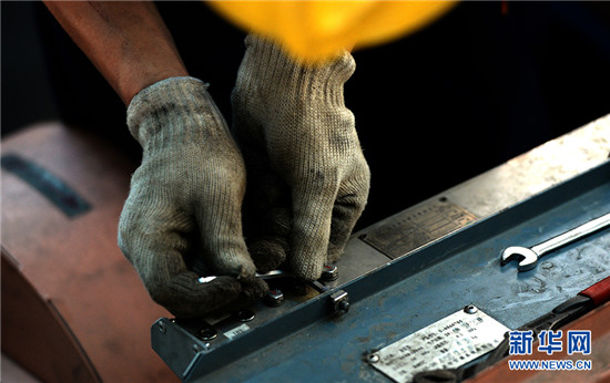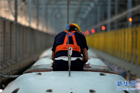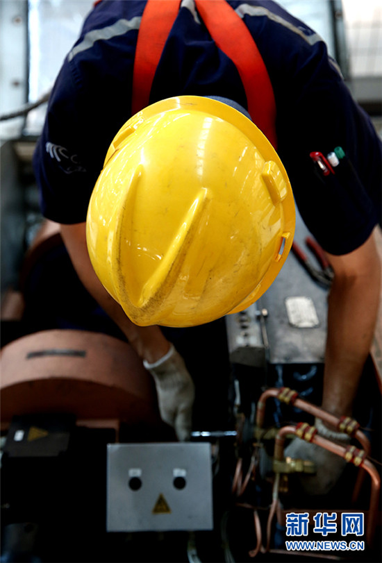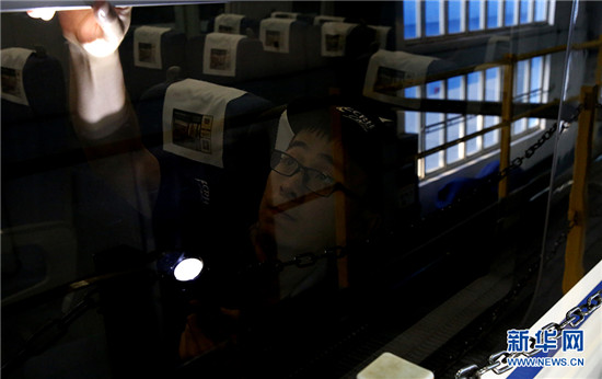 在高達(dá)50℃的動(dòng)車(chē)檢修廠內(nèi),動(dòng)車(chē)組機(jī)械師李洲正在對(duì)CRH380B型動(dòng)車(chē)組空調(diào)系統(tǒng)進(jìn)行故障處理。新華網(wǎng) 陳揚(yáng) 攝