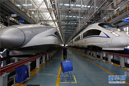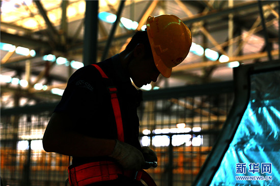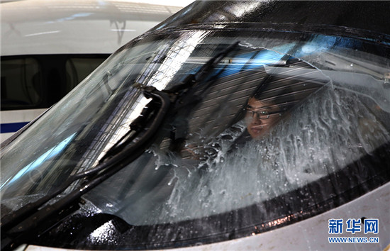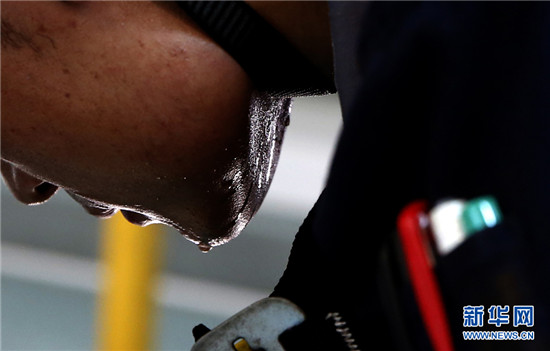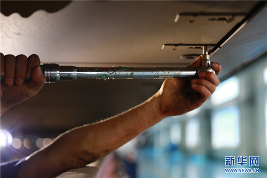 在高達(dá)50℃的動(dòng)車(chē)檢修廠內(nèi),工作人員正在為動(dòng)車(chē)“體檢”。新華網(wǎng) 石璐 攝