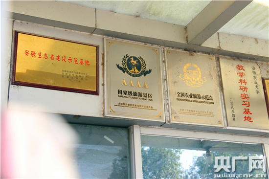 門右側窗口是“游覽接待中心”和“售票大廳”,墻上掛著的一塊由全國旅游景區(qū)質量評定委員會授予的“AAAA國家級旅游景區(qū)”標牌,記錄著這里過去所擁有的輝煌。但此時,落滿塵土的它,早已失去了往日的價值。