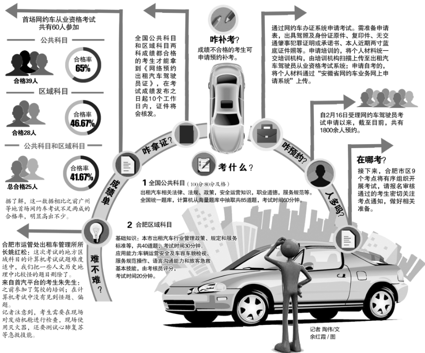 據(jù)安徽商報報道 昨日上午,合肥市首場網(wǎng)絡(luò)預(yù)約出租汽車駕駛員從業(yè)資格考試在合肥軍英(八一)駕校舉行,考試共分為全國公共和合肥區(qū)域兩個科目,每個科目滿分均為100分,及格分各為80分。當(dāng)天60人考試,只有25人通過考試,合格率41.67%。據(jù)了解,考試成績發(fā)布之日起10個工作日內(nèi),合肥市運管部門會為成績合格的考生核發(fā)《網(wǎng)絡(luò)預(yù)約出租汽車駕駛員證》。沒有通過考試的考生可以申請預(yù)約補考。接下來,合肥市區(qū)9個考點將組織開展考試。