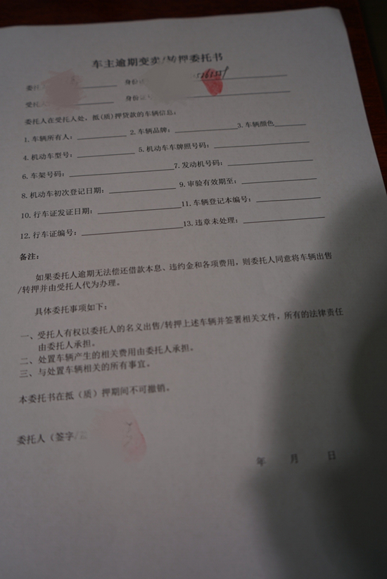 名目繁多的合同和委托書為進(jìn)一步套牢客戶,客戶在簽訂合同時,除了提交身份證、行駛證、車輛購置稅發(fā)票復(fù)印件等材料,還要簽訂以及提交還款說明書、車輛抵押借貸合同、委托書、承諾書和聲明(聲明后果自負(fù))、客戶熟人名單(方便日后催款)、車輛質(zhì)押借款合同(為拖車做準(zhǔn)備的,如果客戶違約,公司就會進(jìn)入質(zhì)押環(huán)節(jié))等等多項材料。