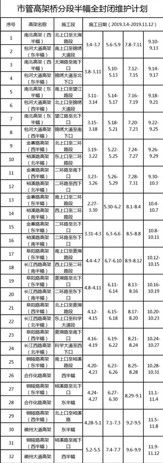為保證高架橋道路安全運(yùn)行和市民安全出行,經(jīng)合肥市人民政府批準(zhǔn),擬定于2019年3月至11月,對(duì)南北高架、包河大道高架等九條高架橋道路進(jìn)行四個(gè)周期部局養(yǎng)護(hù)修繕。依據(jù)《中華人民共和國(guó)道路交通安全法》第三十九條、《中華人民共和國(guó)道路交通安全法實(shí)施條例》第三十五條之規(guī)定,現(xiàn)就道路施工相關(guān)事項(xiàng)公告如下: