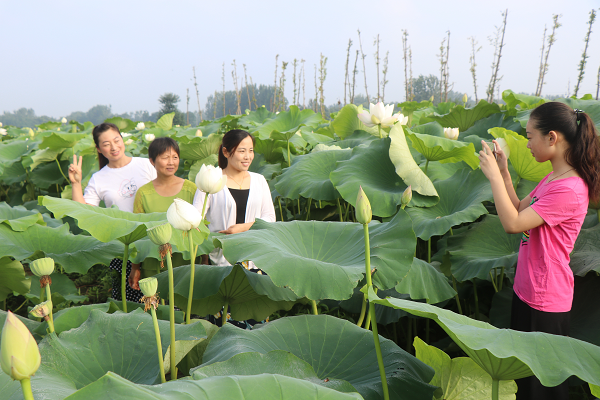 村民在亳州譙城區(qū)牛集鎮(zhèn)靈子門村蓮藕種植基地荷塘拍照。