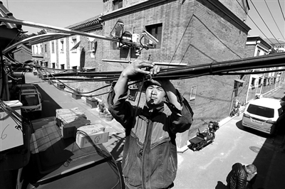 走進(jìn)西總布胡同,抬頭望去,粗細(xì)不一、長(zhǎng)短各異的架空線如同蛛網(wǎng)般橫七豎八地覆蓋在胡同上空!斑@些密密麻麻的線,有網(wǎng)線、有線電視線、電話線、電力的線,還有路燈線!睎|城區(qū)城管委市政科孫哲說(shuō)。