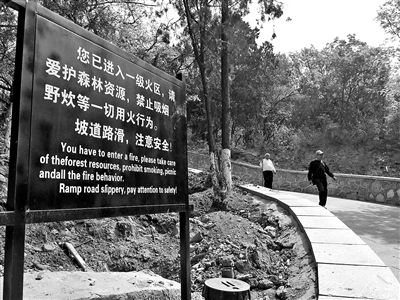 北青報記者探訪發(fā)現(xiàn),從八大處公園大門通往證果寺約2公里的范圍內(nèi),至少有5塊指示牌存在英文翻譯錯誤。其中,在距離證果寺約800米的地方,有一塊長約2米的大型指示牌,提醒人們注意防火,這塊大型指示牌上的文字為“您已進(jìn)入一級火區(qū),請愛護(hù)森林資源,禁止吸煙、野炊等一切用火行為。坡道路滑,注意安全!”這段36個漢字組成的指示語下面,同樣配有英文翻譯。