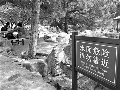 此外,在公園入口處有一片池塘,池塘旁的指示牌上寫著“水面危險,請勿靠近”,其翻譯為“Risk of water surface Please Keep away”。貝斯看過該指示牌的英文翻譯后表示,她認(rèn)為園方提醒的是“地面有積水因此很滑,存在風(fēng)險”。她表示,如果是要提醒避免落水,英國人可能會選擇用英文警示游客“此處水深危險”。