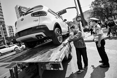 除了高速公路,亞運村交通大隊還在人流車輛密集的望京SOHO周邊設點執(zhí)法。該區(qū)域由于寫字樓密集,配建停車位缺口大,許多人把車輛隨意停放在沒有劃設停車位的路邊,嚴重影響正常交通出行。一位協(xié)管員直言,每天貼條都貼不走違法停車。交警在執(zhí)法中發(fā)現(xiàn),一輛白色起亞牌汽車任性地停放在十字路口導流帶內(nèi),為了逃避處罰,司機不僅摘了車牌,還用紙條把擋風玻璃下的車架號擋上了。無獨有偶,附近一輛違停的長安牌小汽車也用了同樣的伎倆。隨后,交管部門依法對這兩輛車進行了清拖。