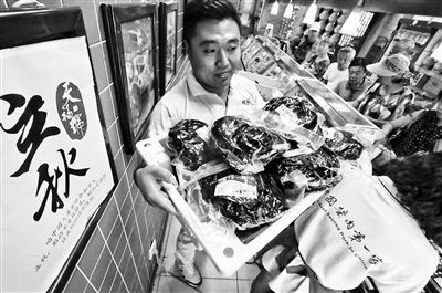 7日早上7點(diǎn)半,西直門(mén)天福號(hào)店提前半小時(shí)開(kāi)門(mén)迎客,從一早開(kāi)始到傍晚,這家門(mén)店客流不斷。除了附近的老街坊,還有不少消費(fèi)者從四面八方冒著酷暑前來(lái)購(gòu)買(mǎi)各類(lèi)肉食!傲⑶锂(dāng)日最應(yīng)景的要數(shù)醬肘子,店里有9.5折優(yōu)惠,吸引了不少顧客,截止到上午9點(diǎn)30分,西直門(mén)店已經(jīng)銷(xiāo)售近900公斤!