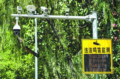 在豐臺(tái)區(qū)十八中考點(diǎn)門口,“聲吶警察”實(shí)時(shí)記錄違法鳴笛情況,并將車牌號(hào)顯示在屏幕上。本報(bào)記者 鄧偉攝