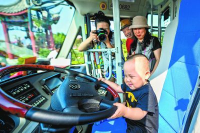 昨天,在北京公交駕校,小朋友坐上最新款電動(dòng)公交車(chē)駕駛座拍照留念。本報(bào)記者 鄧偉攝