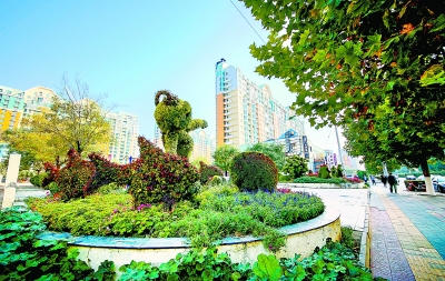 沿鎮(zhèn)國寺北街走一圈兒,會有“久在樊籠里、復(fù)得返自然”的感覺。道路中間景觀帶中,孔雀草、小菊、美蘭菊、醉蝶花等鮮花盤繞,一路綿延。每隔五百米,就有三角梅、小麗花、孔雀草、一品紅等各種花卉組成的花缽映入眼簾,在草橋幼兒園門口、地鐵旁、道路交叉路口等,布置著卡通人物、天鵝等主題花壇。在路邊的人行步道旁,還有一條200米的景觀示范段,休閑設(shè)施、座椅廊架等穿插在五組花境中,置身其中頗有穿越之感。