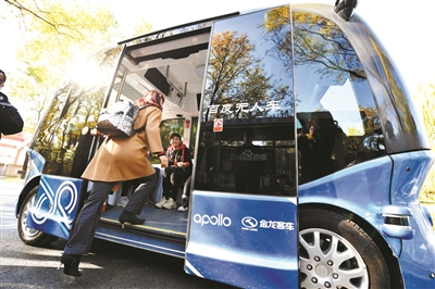 3日,北京青年報記者來到海淀公園,最引人注目的當屬一輛無人駕駛擺渡車——“阿波龍”小巴車。據(jù)現(xiàn)場負責(zé)人介紹,這款車是由百度、金龍客車、英特爾合作生產(chǎn)的全國首輛商用級無人駕駛微循環(huán)電動車,充一次電可行駛100多公里。目前,“阿波龍”提供公園西門與兒童游樂園之間的接駁服務(wù),全程1公里左右,一個往返在15至20分鐘,游客可通過關(guān)注“AI未來公園”微信公眾號進行免費預(yù)約體驗。