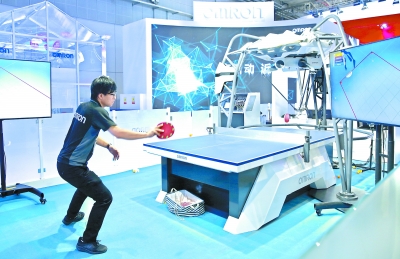 11月4日,工作人員在歐姆龍自動(dòng)化(中國(guó))有限公司展臺(tái)測(cè)試打乒乓球的機(jī)器人。新華社記者 張玉薇 攝