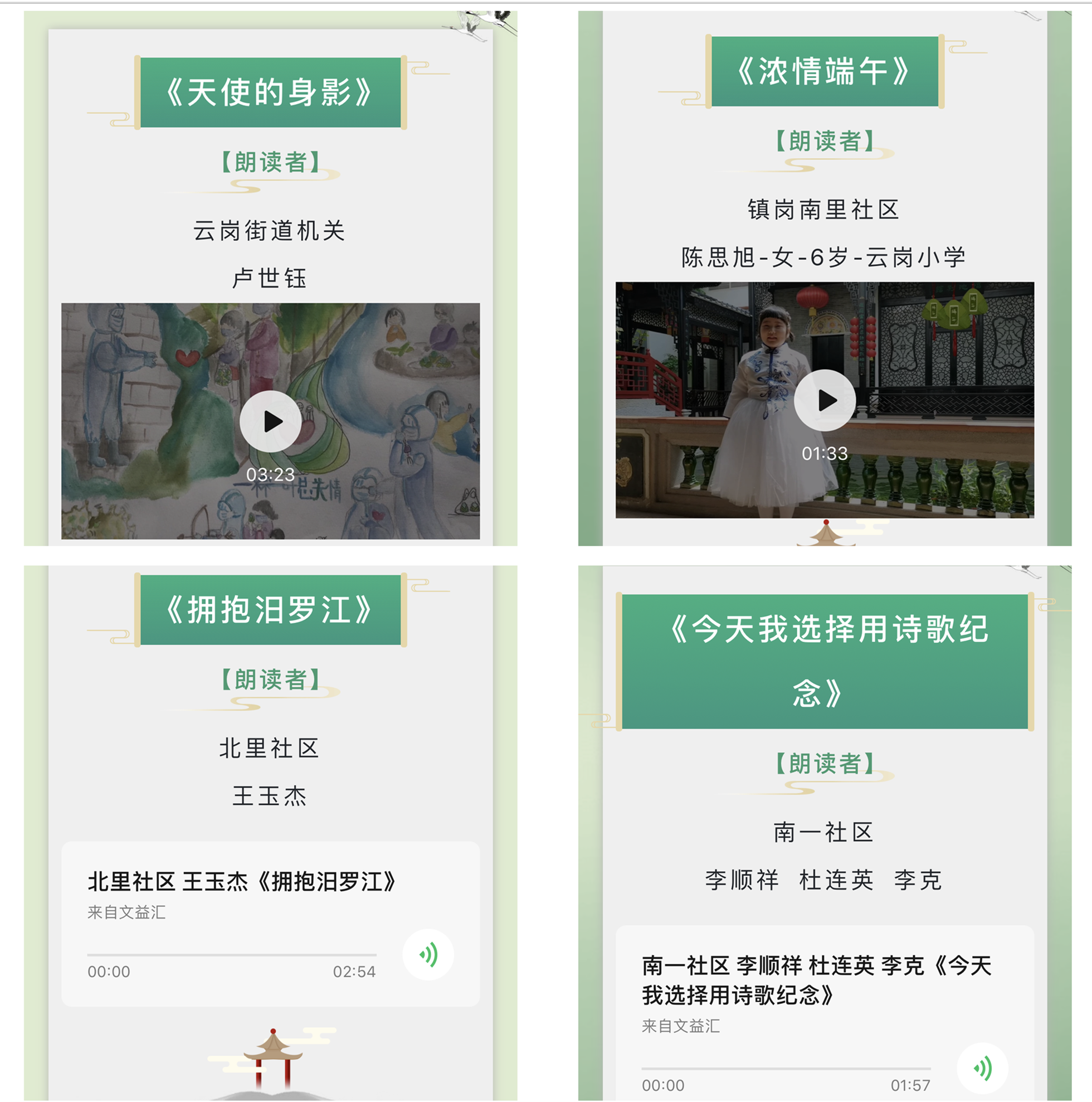 “往年端午節(jié),都是在線下以各種形式舉辦活動(dòng),弘揚(yáng)家國情懷、感受中華優(yōu)秀傳統(tǒng)文化、寄托美好愿望。疫情期間,為防止人流密集、保證居民身體健康,目前還不能開展聚集性活動(dòng),通過‘互聯(lián)網(wǎng)+文化’的形式,讓轄區(qū)居民朋友們匯聚‘云端’,在感受傳統(tǒng)文化魅力的同時(shí),學(xué)習(xí)防疫知識(shí),用聲音、用畫筆為抗疫加油鼓勁!”云崗街道辦事處社區(qū)建設(shè)辦公室副主任李明輝說。