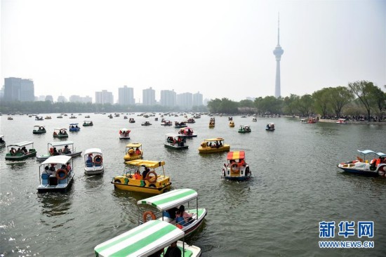 4月3日,游人在北京市玉淵潭公園內(nèi)泛舟娛樂。4月4日,記者從北京市旅游委獲悉,2017年清明小長假,北京市重點監(jiān)測的161家主要景區(qū)游客共計接待563.7萬人次,同比增長12.3%;營業(yè)收入累計1.57億元,同比增長19.5%。其中,頤和園、北海公園、玉淵潭公園等景區(qū)接待游客數(shù)量同比均有大幅度增長。新華社記者張晨霖攝