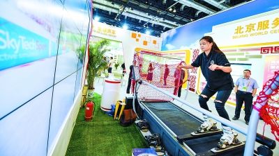 在北京國際服務(wù)貿(mào)易交易會上,一家北京企業(yè)正在演示3D滑雪模擬設(shè)備。本報記者 鄧偉攝