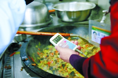 星級食堂到底長啥樣?記者上午做了探訪,換上食堂專用工作服、戴上鞋套、佩戴口罩,走進(jìn)食堂,一側(cè)便是醒目的食堂員工儀容儀表標(biāo)準(zhǔn)規(guī)范:頭發(fā)不外露、請戴口罩、手沒有傷口、不留長指甲、不抹指甲油、不佩戴戒指、肩上無落發(fā)、不戴耳環(huán)……深入食堂,主食初加工區(qū)、細(xì)加工區(qū)、熱加工區(qū)、消毒庫、洗碗間、主食加工區(qū)、備餐間各個空間劃分井井有條。記者注意到,食堂將清洗區(qū)域做了細(xì)致的分工,雞蛋、肉類、魚類分池清洗;抹布也是各司其職,衛(wèi)生專用、死角專用、切配間操作專用毛巾用不同顏色區(qū)分。臨近午餐時間,廚師長拿出了一個細(xì)細(xì)的探頭,探頭一側(cè)連有溫度顯示屏,細(xì)細(xì)消毒后,廚師長將探頭插入鍋內(nèi)正在翻炒的筍片炒肉中,“66.6攝氏度,溫度不夠,還要再加溫。”廚師長解釋說,按照相關(guān)要求,肉菜出鍋溫度應(yīng)達(dá)到90攝氏度,半葷菜需要達(dá)到80攝氏度,素菜出鍋時也要達(dá)到70攝氏度,“一方面是為了衛(wèi)生,一方面也是為了讓孩子吃的時候飯還熱乎!