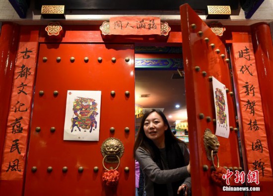 1月27日,由文化和旅游部恭王府博物館和中國(guó)文化傳媒集團(tuán)主辦的“年畫重回春節(jié)”系列活動(dòng)在北京老舍茶館拉開(kāi)序幕,圖為一名市民走出活動(dòng)現(xiàn)場(chǎng)。中新社記者 侯宇 攝