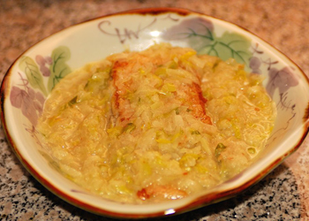 2、鍋里放少量水,加入1/5蟹肉,用適量黃酒、鹽、醋調(diào)味,煮沸后用生粉勾芡(要稀一點哦)。備用。