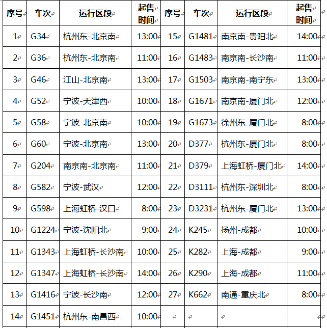央廣網(wǎng)北京12月31日消息 記者從上海鐵路局獲悉,根據(jù)部分鐵路線路擴(kuò)能改造施工和維修的進(jìn)度安排,又一大波列車車票開始發(fā)售。具體如下: