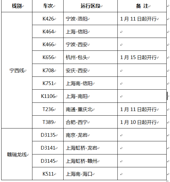 二、根據(jù)寧西(南京—西安)線旅客列車新舊時(shí)刻交替方案、贛瑞龍(贛州—瑞金—龍巖)有關(guān)旅客列車調(diào)整開行及新舊交替方案等安排,自2016年1月2日8:00起,寧西線和贛瑞龍線相關(guān)旅客列車車票統(tǒng)一對外發(fā)售,有關(guān)車次見附件2。