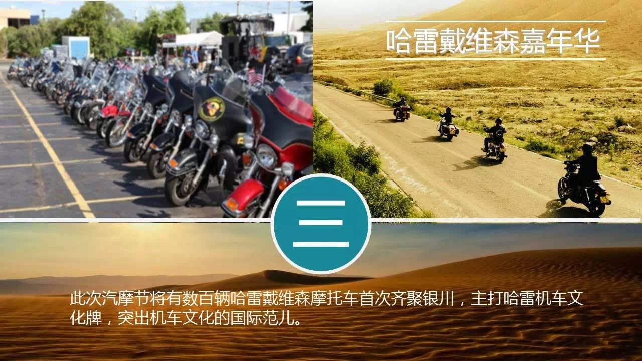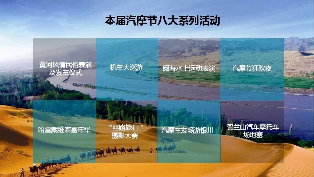 2016年8月7日至9日,首屆中國(guó)·寧夏(銀川)絲綢之路國(guó)際汽車(chē)摩托車(chē)自駕旅游節(jié)暨哈雷戴維森中國(guó)第八屆全國(guó)車(chē)主騎行活動(dòng)將在寧夏回族自治區(qū)首府銀川市舉辦。據(jù)介紹,本屆汽摩節(jié)將舉辦“絲路旅行從銀川啟航”攝影大賽、黃河風(fēng)情民俗展演、賀蘭山汽車(chē)摩托車(chē)場(chǎng)地賽、機(jī)車(chē)大巡游、水上運(yùn)動(dòng)表演、汽摩節(jié)狂歡夜、哈雷戴維森嘉年華、汽摩車(chē)友暢游銀川等八大系列活動(dòng),突出四大亮點(diǎn):