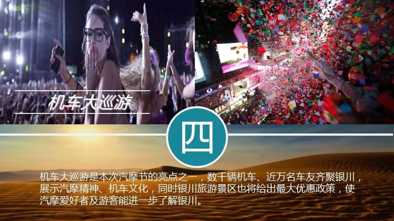 四大點(diǎn)亮包括“穿越絲路 從銀川啟航”為主題的汽車(chē)摩托車(chē)穿越活動(dòng),將會(huì)穿越美國(guó)、迪拜等國(guó)際化現(xiàn)代大都市;亮點(diǎn)二是濱河之夜全國(guó)體育娛樂(lè)明星愛(ài)心足球賽,本次明星賽是此次汽摩節(jié)的開(kāi)幕環(huán)節(jié),已邀請(qǐng)到由孫楠領(lǐng)銜的國(guó)內(nèi)體育界、演藝界明星組成的明星足球隊(duì)來(lái)銀進(jìn)行慈善表演比賽;亮點(diǎn)三是哈雷戴維森嘉年華將在銀川盛大舉行,屆時(shí)將有數(shù)百輛哈雷戴維森摩托車(chē)首次齊聚塞上,并舉行絲路銀川穿越之旅,在閱海舉行狂歡節(jié),點(diǎn)燃盛夏激情,同時(shí)還有路虎、美國(guó)吉普、房車(chē)以及專(zhuān)業(yè)賽車(chē)等前來(lái)助陣;亮點(diǎn)四是銀川十大景區(qū)為本次汽摩節(jié)傾情助陣,提供優(yōu)惠政策,前來(lái)參加汽摩節(jié)的車(chē)手可免費(fèi)參觀各大景點(diǎn)。