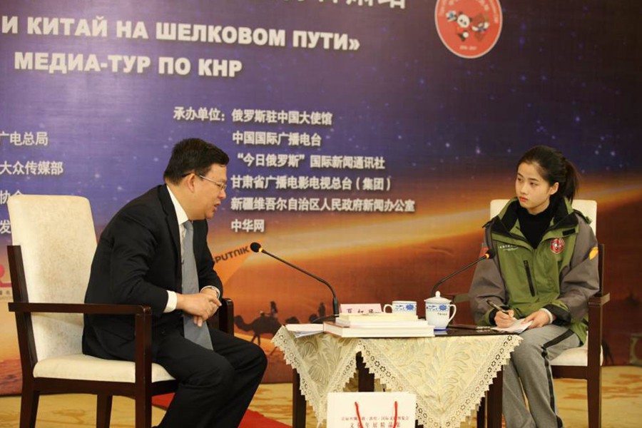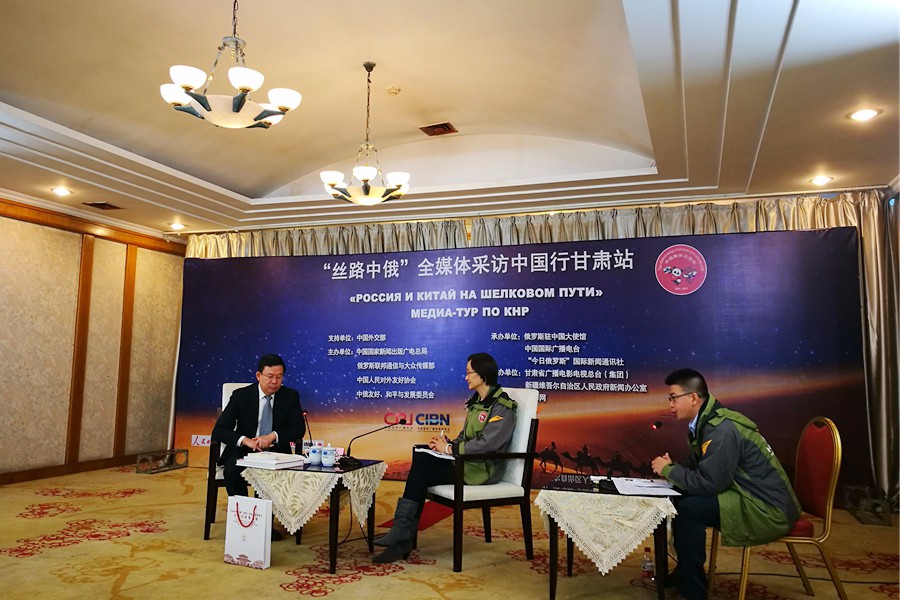 采訪現(xiàn)場(chǎng) 央廣網(wǎng)蘭州10月21日消息(記者張兆福 甘肅站王妍)甘肅省副省長(zhǎng)夏紅民20日上午接受中俄主流媒體的專訪,夏紅民就甘肅省“打造絲綢之路經(jīng)濟(jì)帶黃金段”的戰(zhàn)略構(gòu)想、蘭州新區(qū)的建設(shè)情況、“蘭州號(hào)”中亞國(guó)際貨運(yùn)班列的的運(yùn)營(yíng)情況向記者介紹。 夏紅民介紹,甘肅是絲綢之路的重要通道,絲綢之路西行至甘肅敦煌分為南北兩線!耙粠б宦贰睉(zhàn)略構(gòu)想的提出,讓甘肅從一個(gè)偏遠(yuǎn)和內(nèi)陸省份一躍成為向西開放的前沿陣地和重要門戶。為實(shí)現(xiàn)真正意義的絲路黃金段,甘肅從經(jīng)濟(jì)和文化兩點(diǎn)出發(fā),著力打造以蘭州新區(qū)為重點(diǎn)的經(jīng)濟(jì)平臺(tái)、以絲綢之路國(guó)際文化博覽會(huì)和華夏文明傳承創(chuàng)新區(qū)為重點(diǎn)的文化交流合作平臺(tái),以及以中國(guó)蘭州投資貿(mào)易洽談會(huì)為重點(diǎn)的經(jīng)貿(mào)合作平臺(tái)。 面對(duì)記者們關(guān)心的蘭州新區(qū)建設(shè)問題,夏紅民說,與其他新區(qū)不同,蘭州新區(qū)建設(shè)之初并沒有工業(yè)基礎(chǔ),屬于“白手起家”。為彌補(bǔ)產(chǎn)業(yè)發(fā)展不足的缺陷,蘭州新區(qū)將加強(qiáng)供給側(cè)結(jié)構(gòu)性改革,立足提高經(jīng)濟(jì)發(fā)展的質(zhì)量和效益。同時(shí)引入更多的教育、醫(yī)療等資源,為蘭州新區(qū)的進(jìn)一步發(fā)展提供更多的人才保障。 “隨著絲綢之路經(jīng)濟(jì)帶建設(shè)的深入,越累越多國(guó)家和地區(qū)參與到建設(shè)行列中來,之間是否存在競(jìng)爭(zhēng)關(guān)系呢?”來自“今日俄羅斯”國(guó)際新聞通訊社的卡普拉諾娃·尤利婭在采訪中帶有這樣的疑問。針對(duì)俄方記者的疑問,夏紅民表示,古代絲綢之路的歷史證明,開放合作能夠使得國(guó)家之間優(yōu)勢(shì)互補(bǔ)、資源共享,是一個(gè)互惠互利的過程。現(xiàn)階段“絲綢之路經(jīng)濟(jì)帶”的建設(shè)也是要秉持和平合作、開放包容、互學(xué)互鑒、互利共贏的核心理念。
