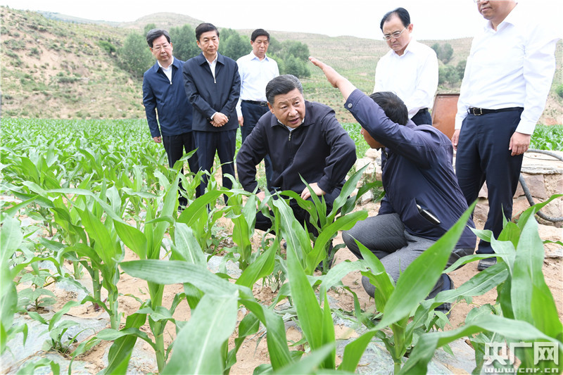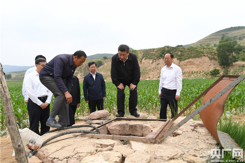 習(xí)近平走進趙家洼村的一片農(nóng)田,察看玉米和蕓豆長勢。村支書告訴總書記,因為干旱,莊稼植株矮小,產(chǎn)量很低,村民們靠天吃飯。總書記向村民了解了地膜的保墑作用?倳泚淼酱謇镂ㄒ坏囊豢陲嬎裕巧嫌檬瘔K壘起的井臺,仔細察看井里蓄水的情況。