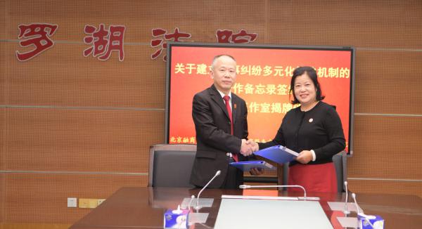 一帶一路國際商事調(diào)解中心粵港澳大灣區(qū)中心主任涂江麗與深圳市羅湖區(qū)人民法院訴訟服務(wù)中心主任胡建忠簽署《關(guān)于建立商事糾紛多元化解決機(jī)制的合作備忘錄》(央廣網(wǎng)發(fā) 法院供圖)