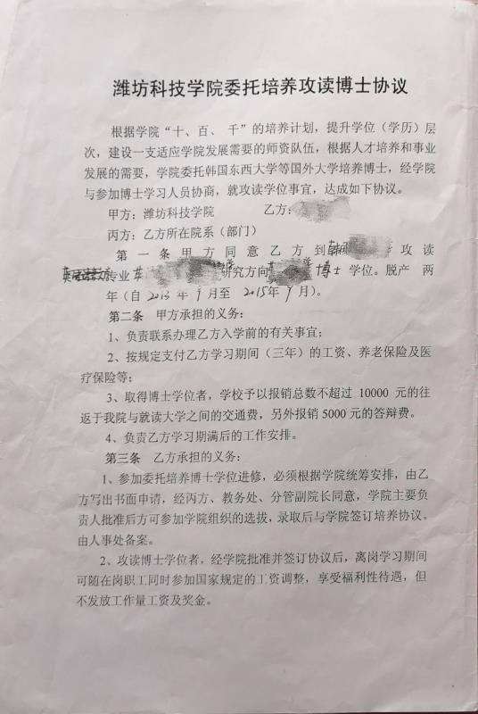 張老師給中國之聲發(fā)來的這份協(xié)議中寫到,“學(xué)院委托韓國東西大學(xué)等國外大學(xué)培養(yǎng)博士,經(jīng)學(xué)院與參加博士學(xué)習(xí)人員協(xié)商,就攻讀學(xué)位事宜,達成如下協(xié)議”,其中包括學(xué)校支付乙方學(xué)習(xí)期間(三年)的工資、養(yǎng)老保險及醫(yī)療保險等,同時乙方攻讀博士學(xué)位,不轉(zhuǎn)本人人事檔案、工資關(guān)系等有關(guān)手續(xù)……如在服務(wù)期限內(nèi)調(diào)離學(xué)校,所發(fā)放工資和報銷經(jīng)費按實際服務(wù)月數(shù)沖銷后,余額如數(shù)返還學(xué)校等。