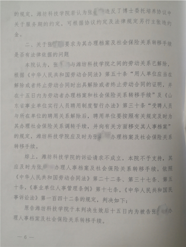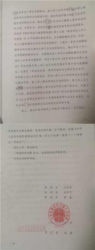 濰坊科技學(xué)院對上述仲裁結(jié)果不服,訴至壽光法院。2020年1月19日,壽光法院作出一審判決,濰坊科技學(xué)院敗訴,法院判定學(xué)校方面應(yīng)及時為張老師辦理人事檔案及社會保險關(guān)系轉(zhuǎn)移手續(xù)。濰坊科技學(xué)院提起上訴,2020年6月1日,濰坊中院駁回濰坊科技學(xué)院的上訴,維持原判。