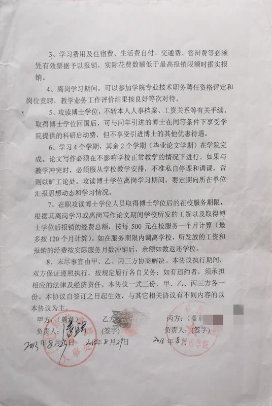 讀博士之前,學(xué)校與張老師簽訂了一份協(xié)議。她說:“當(dāng)時和學(xué)校簽訂了協(xié)議,兩年的脫產(chǎn)時間,兩年之后回學(xué)校邊寫論文邊上班,確切的說應(yīng)該是2015年8月就回學(xué)校上班了!