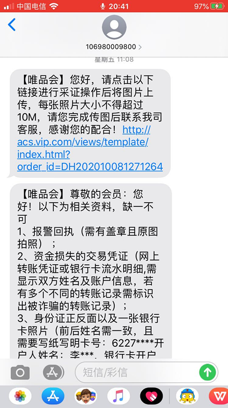 被騙后,受害者除了第一時間向警方報案外,還與唯品會聯(lián)絡(luò),質(zhì)疑其為何會把自己的隱私泄露?幾位受害人告訴記者,在他們向唯品會提交手持身份證照片等隱私數(shù)據(jù)后,唯品會向部分被騙用戶“墊付”了損失,并要求他們承諾,一旦警方破案拿到被騙款項,返還墊付款項。但李女士認(rèn)為,把手持身份證照片給到唯品會,無疑又增加了一層隱私泄露的風(fēng)險。李女士說:“承諾書的話就是本人身份證號、聯(lián)系電話、地址,本人在唯品會購物后,因輕信不法分子遭遇網(wǎng)絡(luò)詐騙,本人損失為多少。本人于幾月幾日向警方報案,報警回執(zhí),現(xiàn)在唯品會從客戶體驗角度出發(fā),預(yù)先向本人墊付,后面就是本人向唯品會承諾,如警方后續(xù)追款成功,本人將向唯品會退還警方追款成功的金額,否則唯品會有權(quán)通過法律途徑向本人予以追索全部墊付款。承諾人身份證號這些!