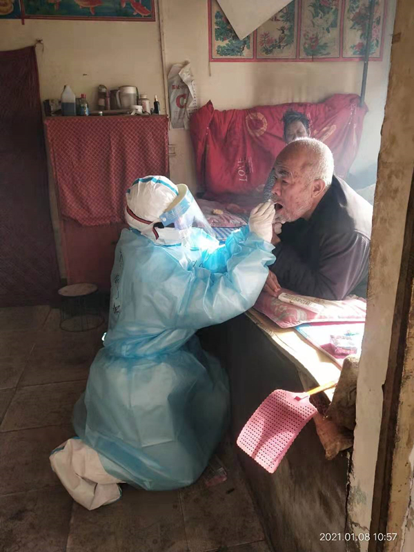 藁城區(qū)是高風(fēng)險(xiǎn)地區(qū),對(duì)于重點(diǎn)人群、區(qū)域要進(jìn)行多次核酸檢測(cè)。郭嬌嬌說(shuō),她平均每天要給三四百人做核酸采集工作,印象最深的是一位老人。入戶到老人家里,當(dāng)時(shí)老人躺在床上,為了更清楚地看到采集部位,保證標(biāo)本采集質(zhì)量,郭嬌嬌跪在地上,用手托住老人的下頜。她說(shuō):“當(dāng)時(shí)入戶采集的時(shí)候,這一家這個(gè)老爺爺可能家里邊沒有孩子,只有老爺爺跟老奶奶在家,門口也沒有門,只有玉米穗堆成的墻頭。進(jìn)去之后,老奶奶就在床上坐著,老爺爺在床上趴著,因?yàn)樗粍?dòng)就會(huì)喘,我就說(shuō)你不用動(dòng),我就直接蹲下給他采集的,完了之后老爺爺還說(shuō)你們太辛苦了,坐會(huì)吧!