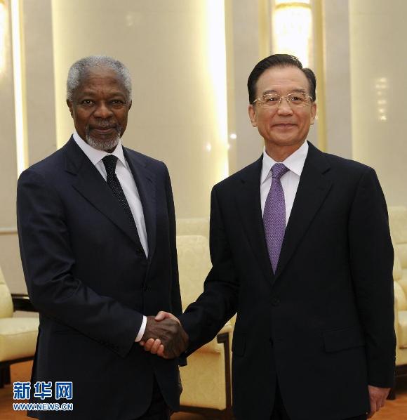 3月27日,國務(wù)院總理溫家寶在北京人民大會堂會見聯(lián)合國-阿盟敘利亞危機聯(lián)合特使安南。 新華社記者 饒愛民 攝