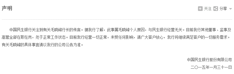 業(yè)內(nèi)普遍認(rèn)為,民生銀行發(fā)布公告對(duì)此事進(jìn)行回應(yīng)已經(jīng)從側(cè)面證實(shí)此前毛曉峰的相關(guān)傳言。
