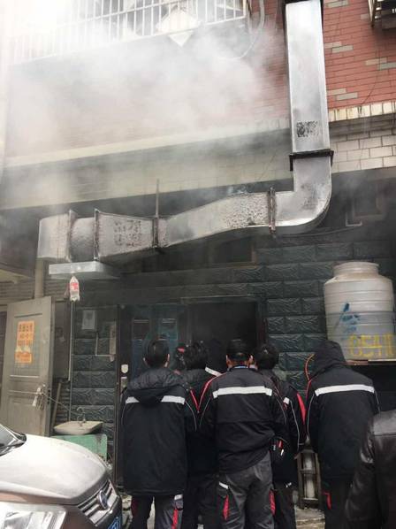 當時飯店還沒有開門,兩人圍著飯店找了一圈才發(fā)現(xiàn),是后門廚房的油煙機著火了;饎菀呀(jīng)很大,兩人沒多想,立馬跑回單位取滅火器,并呼叫救援。再次折回的二人抱著滅火器就沖進了火場。
