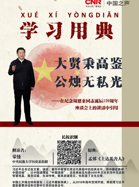中國之聲特別策劃《習(xí)近平最新用典》,梳理習(xí)近平最新重要講話和文章中引用的經(jīng)典名句。今天的《習(xí)近平最新用典》,請看習(xí)近平在紀念周恩來誕辰120周年座談會上的講話中使用的“大賢秉高鑒,公燭無私光”。解讀嘉賓:中央民族大學(xué)歷史系教授蒙曼。