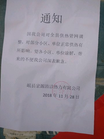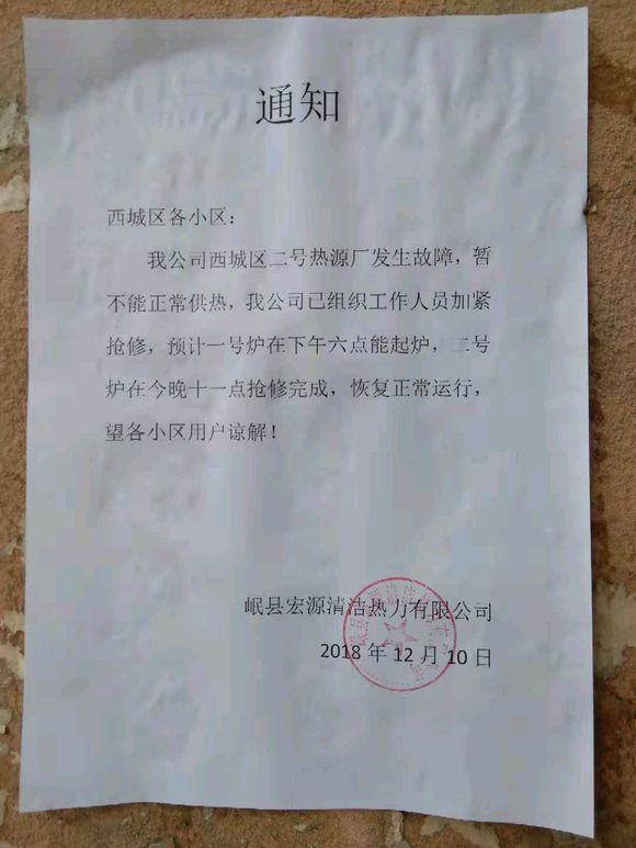 根據(jù)網(wǎng)友提供的圖片,在2018年11月28日、12月10日,宏源清潔熱力公司以管網(wǎng)調(diào)整、熱源廠發(fā)生故障等原因暫停了供暖。