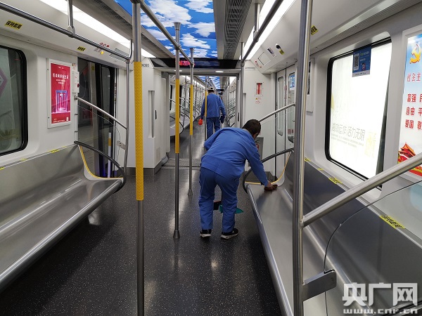 地鐵11號(hào)線列車,工作人員在為車廂消殺清潔(中央廣播電視總臺(tái)央廣記者 肖源 攝)
