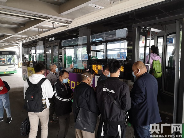 掃碼測(cè)溫后等待上公交車的市民(中央廣播電視總臺(tái)央廣記者 肖源 攝)