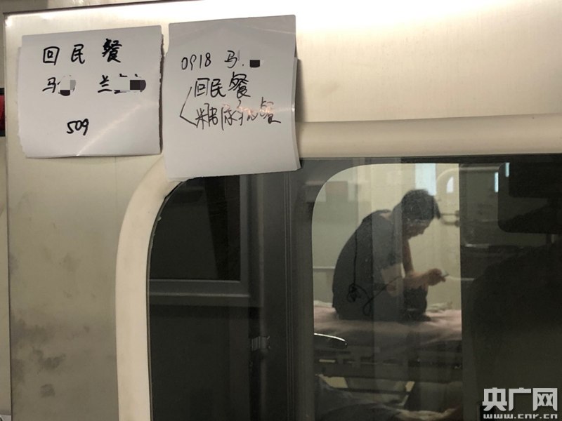 6月16日,北京地壇醫(yī)院第五病區(qū),透過貼有供餐需求的消毒傳遞柜,可以看到患者正在病床上看手機(中央廣播電視總臺央廣記者 白杰戈 攝)
