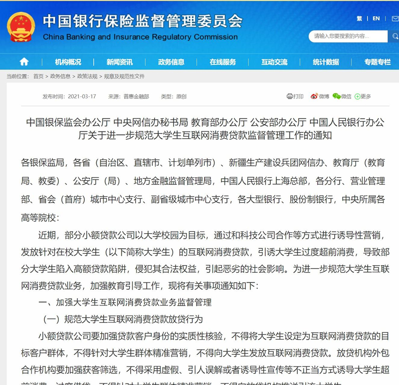 央廣網(wǎng)北京3月18日消息 據(jù)中央廣播電視總臺中國之聲《新聞有觀點》報道,3月17日,銀保監(jiān)會、中央網(wǎng)信辦、教育部、公安部、中國人民銀行五部門聯(lián)合印發(fā)《關(guān)于進(jìn)一步規(guī)范大學(xué)生互聯(lián)網(wǎng)消費(fèi)貸款監(jiān)督管理工作的通知》(以下簡稱《通知》),明確小額貸款公司不得向大學(xué)生發(fā)放消費(fèi)貸款,花唄、借唄不能向大學(xué)生放款了?