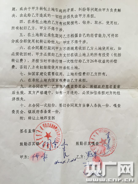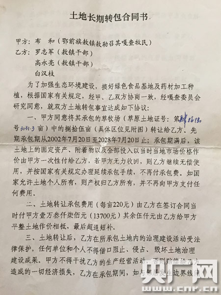 敖鎮(zhèn)干部承租布和其勞的草場(chǎng)合同(央廣網(wǎng)記者 白宇 攝)