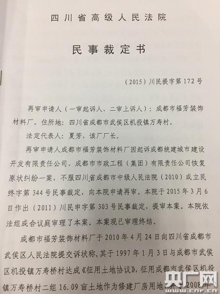 夏芳說:“2010年就開始起訴市統(tǒng)建辦,武侯區(qū)法院沒有受理,說我的土地被征收了。7月份拿到裁定之后,我馬上去市中院,但中院也維持了武侯區(qū)法院的裁定,沒有立案,告訴我是和省政府的拆遷文件有關!