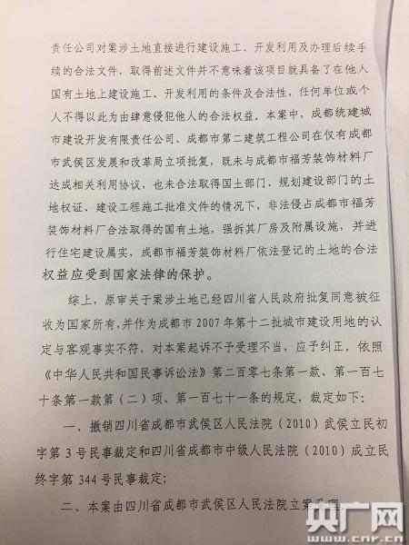 夏芳又向四川省高院提出了再審申請。高院的裁定書顯示,四川省政府此次同意征收的八塊土地均為農村集體土地,并不涉及國有土地以及夏芳的廠房所在地塊。四川省高院裁定,成都市統(tǒng)建辦、成都市第二建筑公司非法侵占了夏芳廠房合法取得的國有土地,成都市統(tǒng)建辦將夏芳土地納入城中村改造項目,歪曲了四川省政府文件規(guī)定的征地對象以及適用范圍。