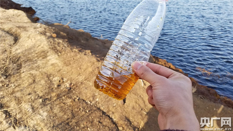 記者用礦泉水瓶盛出一些坑內(nèi)的水體,呈半透明的棕色,氣味更加明顯。(央廣記者 白杰戈 王逸群 攝)